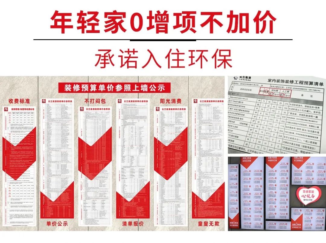 云蘭裝潢還將住宅裝修工程中,絕大部分所涉及到的裝修項目的材料費單價、人工費單價都詳細列表,張貼在總部店和各門店業務大廳的墻上,客戶均可對照自己的預算清單來逐條核對,杜絕了同樣裝修不同價、低開高走及開工后狠加錢的惡象。云蘭裝潢提供的一站式陽光消費服務,堅決摒棄低開高走、亂開價的市場“潛規則”。