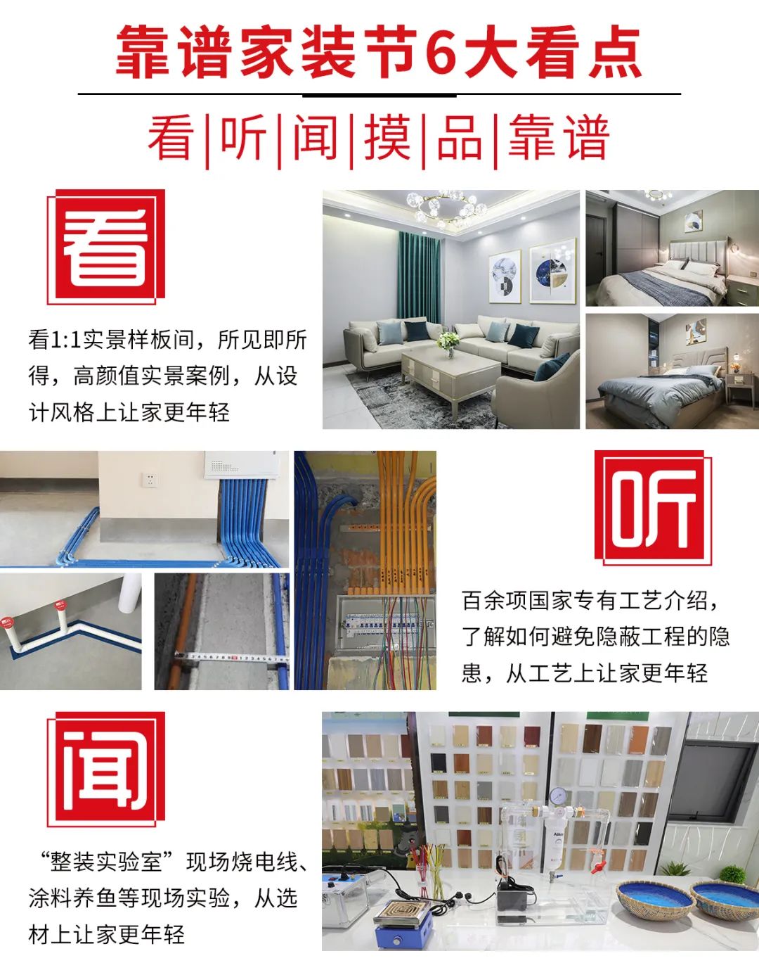 本次活動云蘭裝潢圍繞6感“看”、“聽”、“聞”、“摸”、“品”、“靠譜”讓業主可以沉浸式的體驗到“年輕家整裝”。