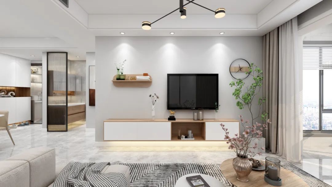 遵從簡約的設計本心,客廳選擇了無主燈的設計類型,用更加有層次感和設計感的筒燈和射燈加以代替。