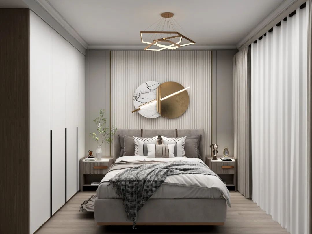 臥室的一側(cè)做上白色的嵌入式衣柜,然后搭配淺灰色的背景墻和床品,頂部的吊頂還加上了藏光,這樣的臥室讓人感覺素雅而又舒適。