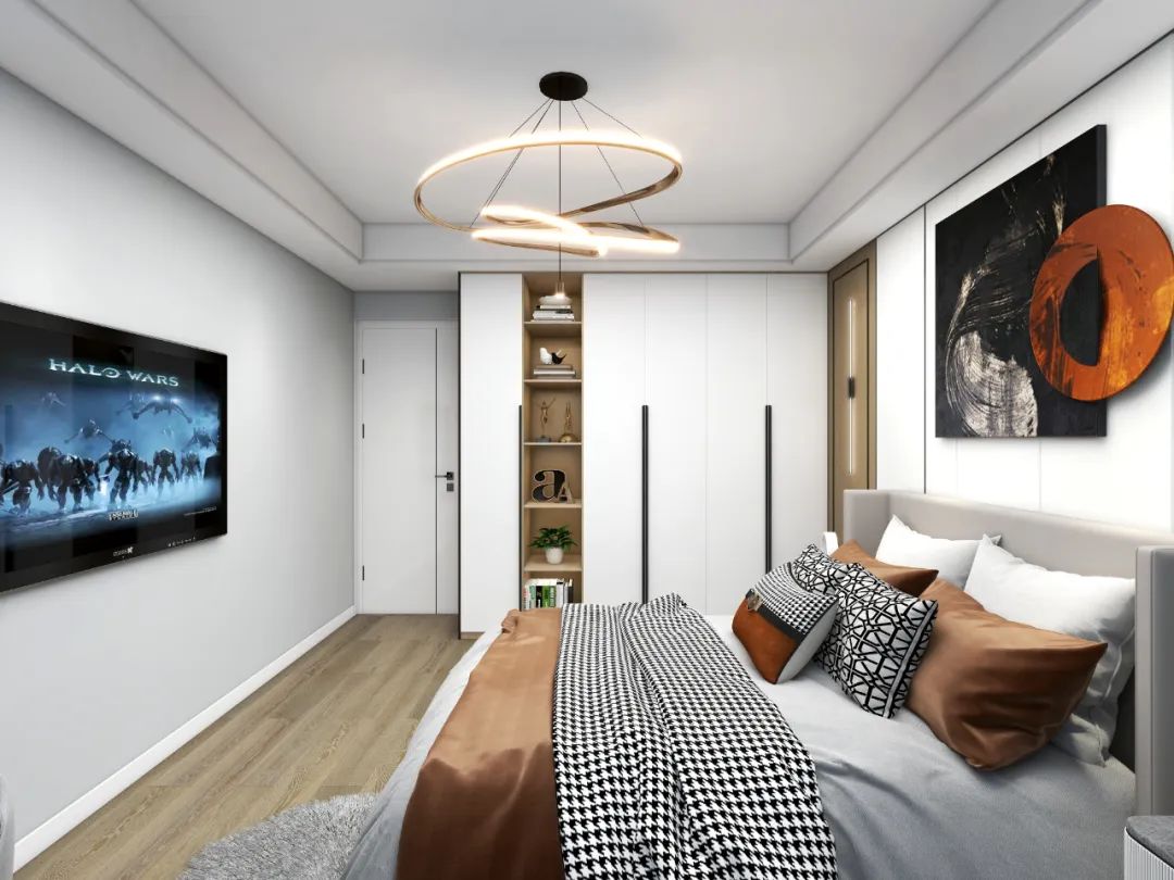 臥室里的衣柜也可以不做整墻的設(shè)計,在衣柜側(cè)方留出書桌的區(qū)域,一部分開放式的格局也能讓臥室看起來寬敞不少。