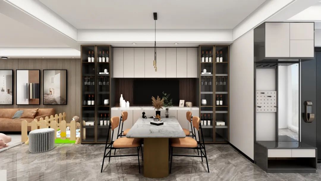 餐廳的拐角處,除了安裝轉角柜,也可以將卡座設計在轉角處,打造卡座式餐廳,收納、用餐二合一。