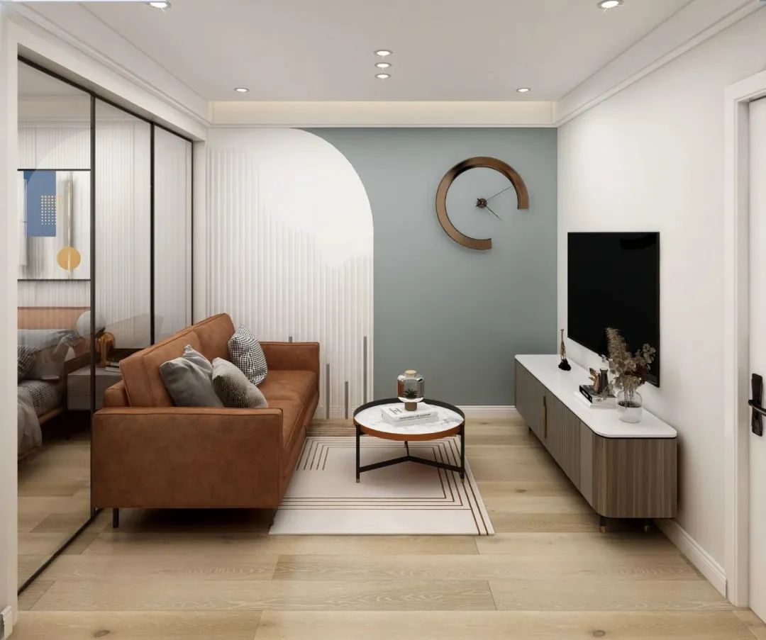 電視背景墻上就算不做什么裝飾,只是在角落擺放了一個掛鐘。電視柜、創意凳子和綠植就能讓電視背景墻顯得非常好看了。