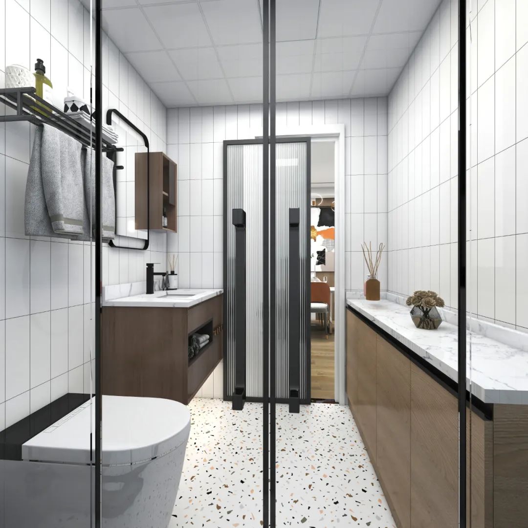 小衛(wèi)生間沒有窗但是一定有門,相比木門,透明玻璃門顯然更適合小黑屋,既合理分區(qū),又保證了采光。