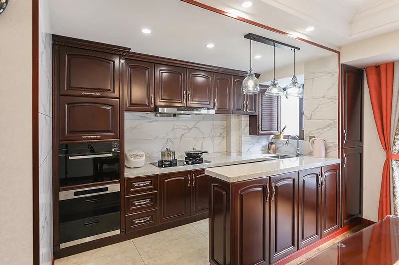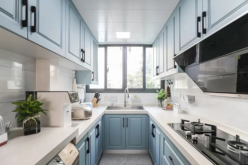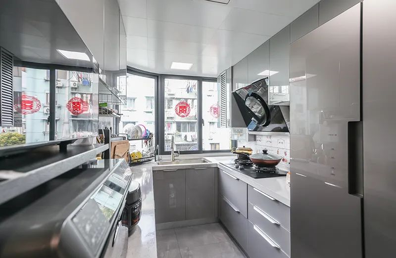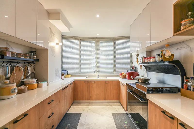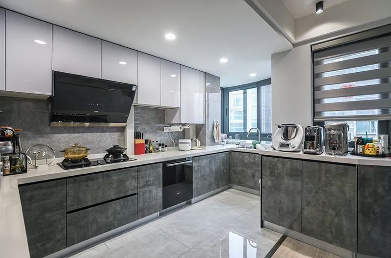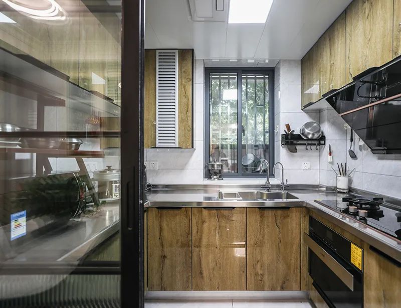 將洗碗機、微波爐、烤箱這類的電器與櫥柜一起定制,達到廚電一體化的效果,也能幫助臺面減輕不少負擔,為廚房節省不少收納空間。