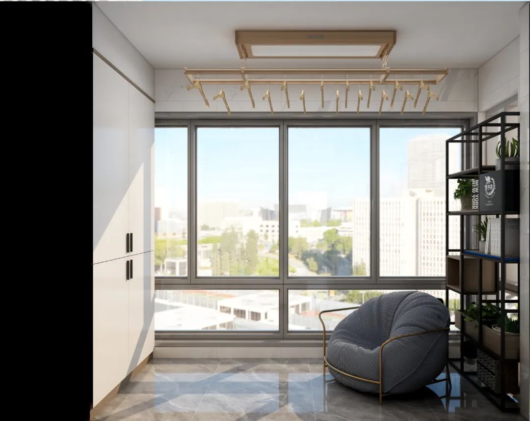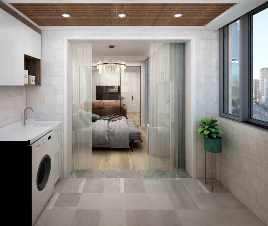 陽臺做成開放式,那么曬衣物的問題也來了,可以采取洗衣機+烘干機的組合,無疑是一個空間實用、效果大方的設計。