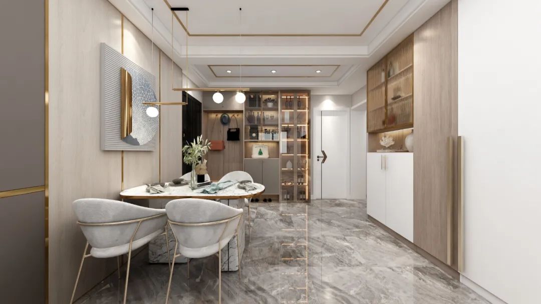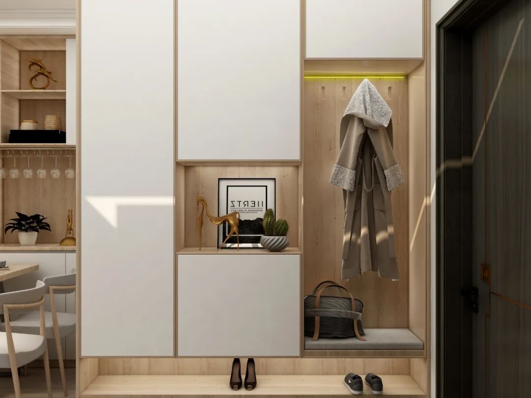 自帶小柜子的換鞋凳足以收納玄關的零碎物品,柜子臺面還可以做一些裝飾陳列;或者沿著玄關通道一側墻面安一排矮柜,整個過道都能坐。