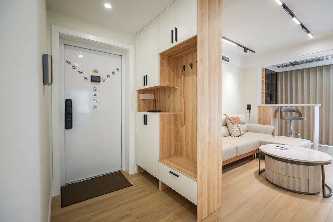在設(shè)計(jì)玄關(guān)過(guò)道的時(shí)候,為了保證行走通暢,過(guò)道距離要保持在120cm以上,如果再做鞋柜,那么過(guò)道寬度需要在150cm以上才舒適。