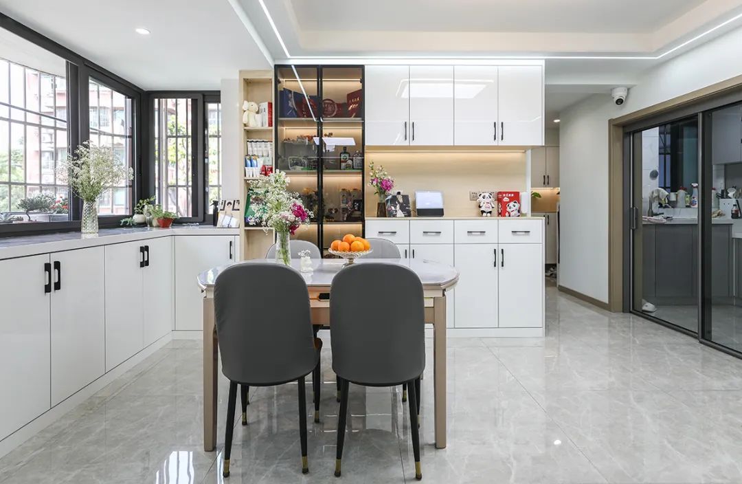 為了營(yíng)造溫馨的就餐氛圍,吊燈和桌面之間的最理想的距離為70-80cm,在這樣的距離下,光束能均勻的照射到桌面,又不會(huì)覺(jué)得壓抑。餐邊柜的大小沒(méi)有特定的標(biāo)準(zhǔn),可以按照空間的布局來(lái)設(shè)計(jì),而深度則需要考慮到儲(chǔ)物所需容量,一般會(huì)做成40-60cm左右,常見(jiàn)的物品都能容納。