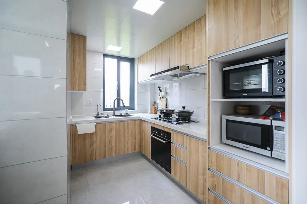 吊柜到操作臺(tái)的距離為60-70cm比較合適,伸手就可以輕松夠到又不會(huì)碰到頭。操作臺(tái)的高度要根據(jù)操作者身高來(lái)決定,身高150cm-170cm對(duì)應(yīng)80cm-90cm,這里給大家一個(gè)計(jì)算公式進(jìn)行參考:臺(tái)面高度=身高÷2+(5-10cm)。要注意的是,水槽區(qū)臺(tái)面最好要比烹飪區(qū)高5-10cm,以免出現(xiàn)長(zhǎng)時(shí)間彎腰洗菜洗碗或長(zhǎng)時(shí)間抬手炒菜而腰背、手臂酸痛的情況。