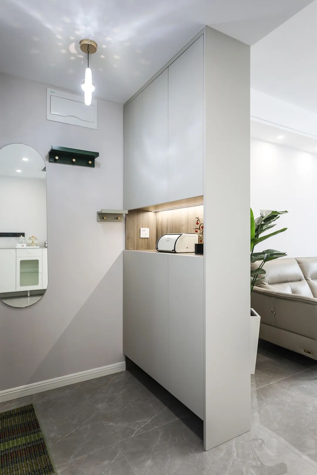 無(wú)論是不是開(kāi)門見(jiàn)廳的戶型,鞋柜總是少不了的。我們不妨直接在入門的地方擺上柜子,或直接用鞋柜當(dāng)作一面隔斷。