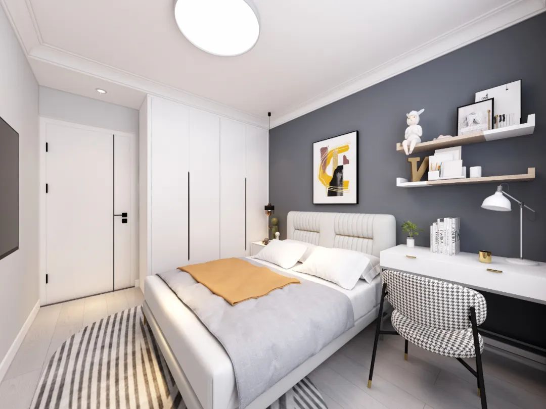 還可以根據臥室整體設計打柜子,充分利用空間上方位置,打造書桌+梳妝臺一體功能??看耙粋鹊氖釆y臺,柜面與衣柜留空齊平,讓整面墻的柜子造型既不單調卻又風格統一。