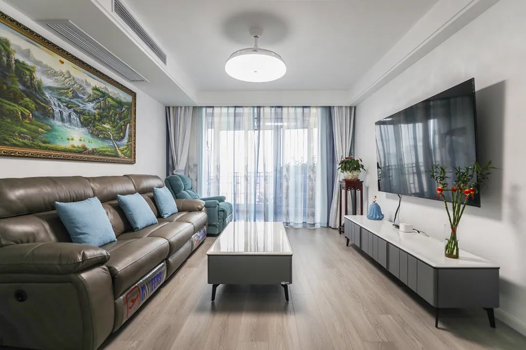 該房業主是一對夫妻,都是退休教授,對生活品質要求高,在造型上追求簡約穩重,色彩搭配上要求溫馨而不失高雅。基于業主的需求,該套居室搭配色采用暖灰木紋色搭配暖白色的基色,讓整個房子呈現出客戶想要的高貴大方,溫暖宜居的感覺。電視墻以大面積玻璃櫥柜,在提供客戶儲藏展示書籍、展品的同時,增加空間通透感。放置藍灰色皮質沙發,再用白色巖板茶幾搭配,體現現代風格的大氣時尚,簡潔、神秘和有質感,通過這裝飾布置打造出退休教授夫妻的頤養三居,塑造出簡中有序恰好處的氛圍感。