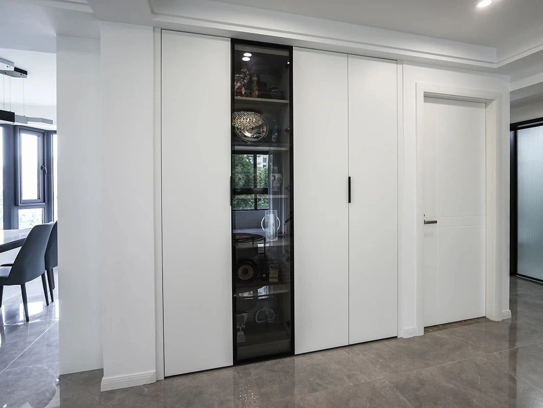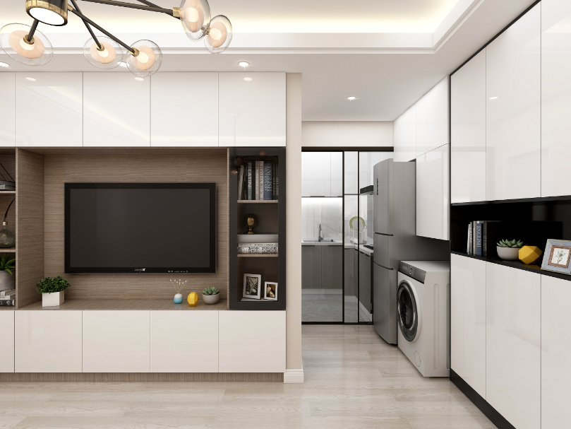 衣柜、鞋柜、電視柜等,這些家具需要定制。首先,白色門板與黑色開放式格柜相匹配。最好通頂設計,或者與您的天花板完美連接。