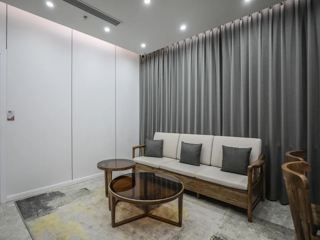客廳沙發的背景是純色灰窗簾,簡潔的造型和精細的工藝,從進門那一刻便收獲一份豁然的心境。