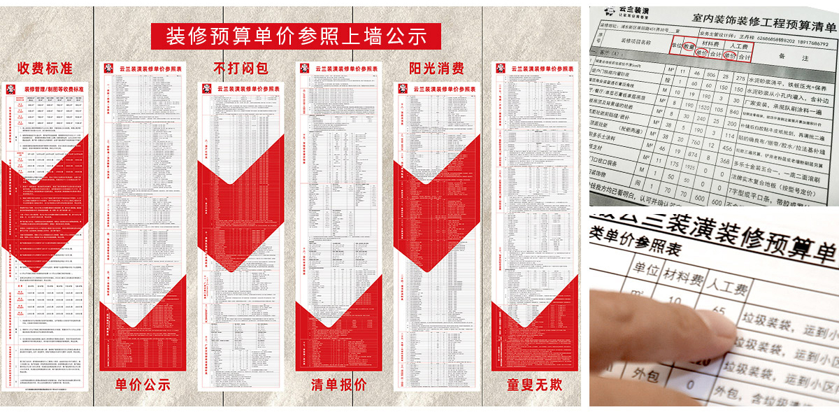 鑒于套餐式定制和套餐式裝修有很多隱性的收費(fèi),很容易給客戶帶來不好的裝修體驗(yàn),甚至還會(huì)和客戶產(chǎn)生糾紛,從而影響公司口碑,進(jìn)而影響裝修行業(yè)聲譽(yù)。于是云蘭裝潢堅(jiān)持清單裝修報(bào)價(jià),根據(jù)一套房子的不同空間、不同的結(jié)構(gòu)、不同的裝修需求,確定的整體設(shè)計(jì)方案,對空間和項(xiàng)目進(jìn)行詳細(xì)報(bào)價(jià)。比如客廳,主要項(xiàng)目有頂面、墻壁、地板、門窗等。并且有詳細(xì)的工程量計(jì)算,畢竟房子各區(qū)域面積不會(huì)變,工程量不會(huì)改變。業(yè)主還可以根據(jù)自己的裝修預(yù)算,調(diào)整所需的材料和風(fēng)格。以客廳為例,是否需要電視墻,需要什么樣的風(fēng)格,天花板有多大,如何處理墻壁,如何改造,使用什么樣的材料。