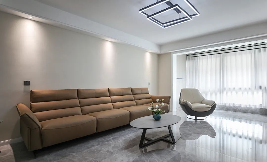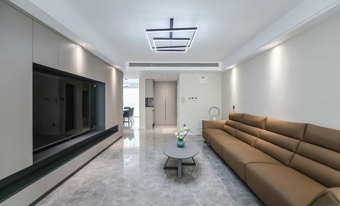 3米多的長沙發(fā),咖色加上原本暖灰的瓷磚,奶咖色的電視柜,顏色統(tǒng)一有層次。