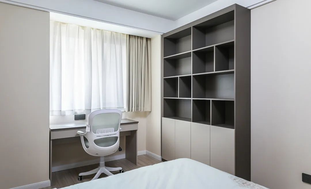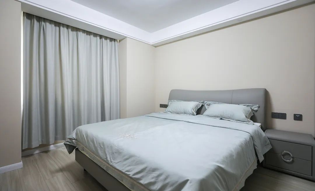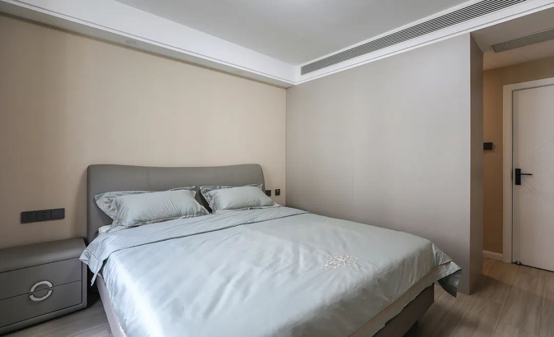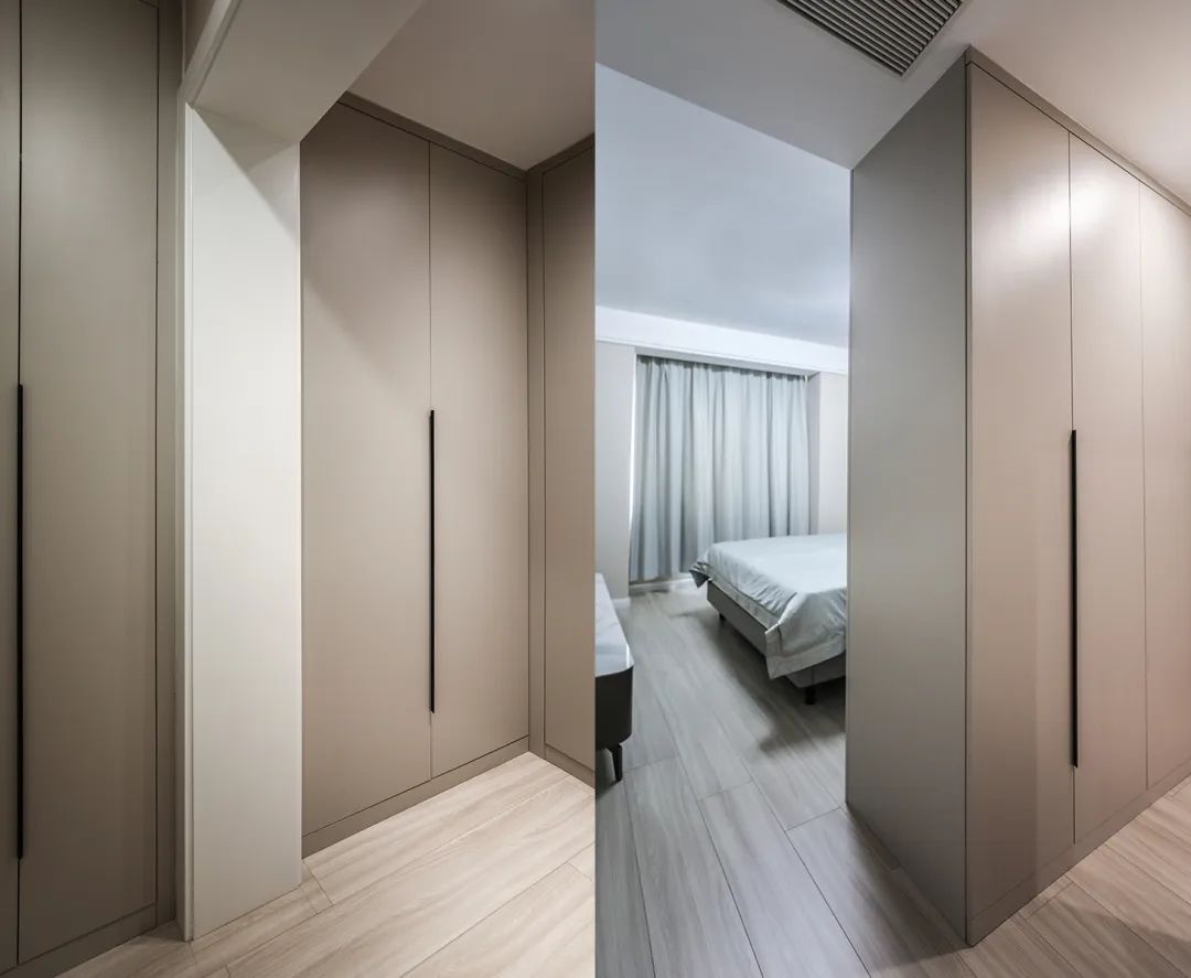 臥室做了轉(zhuǎn)角衣柜流出來的過道直角通向衣帽間,私密度更好儲物翻了一倍,色調(diào)還是以大氣的奶咖色,時尚耐看。