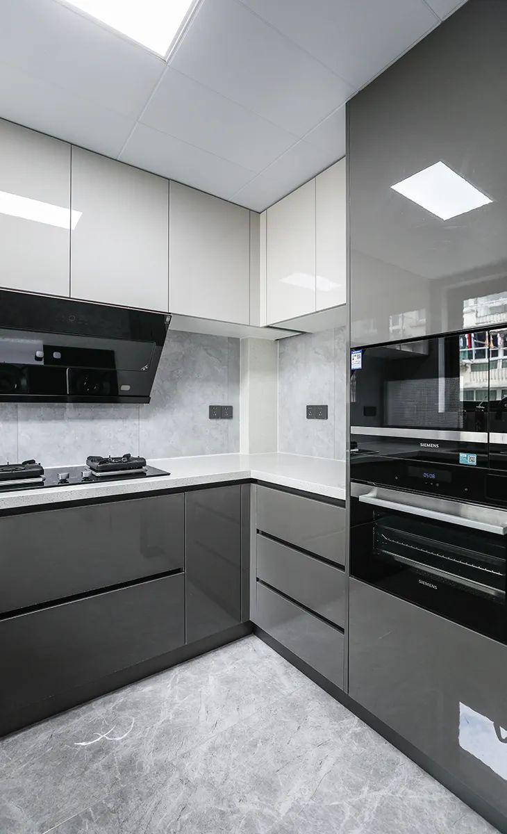 該套房子廚房空間很大,原本L型的櫥柜后期改成了U字型,雙開門的冰箱放在了外面的餐邊柜邊上,廚房灰白色調(diào),下柜打理衛(wèi)生方便,上柜白色吊柜滿做也不壓抑,還做了一面立柜蒸烤箱取物不用彎腰,下柜和上柜又有很多儲物。