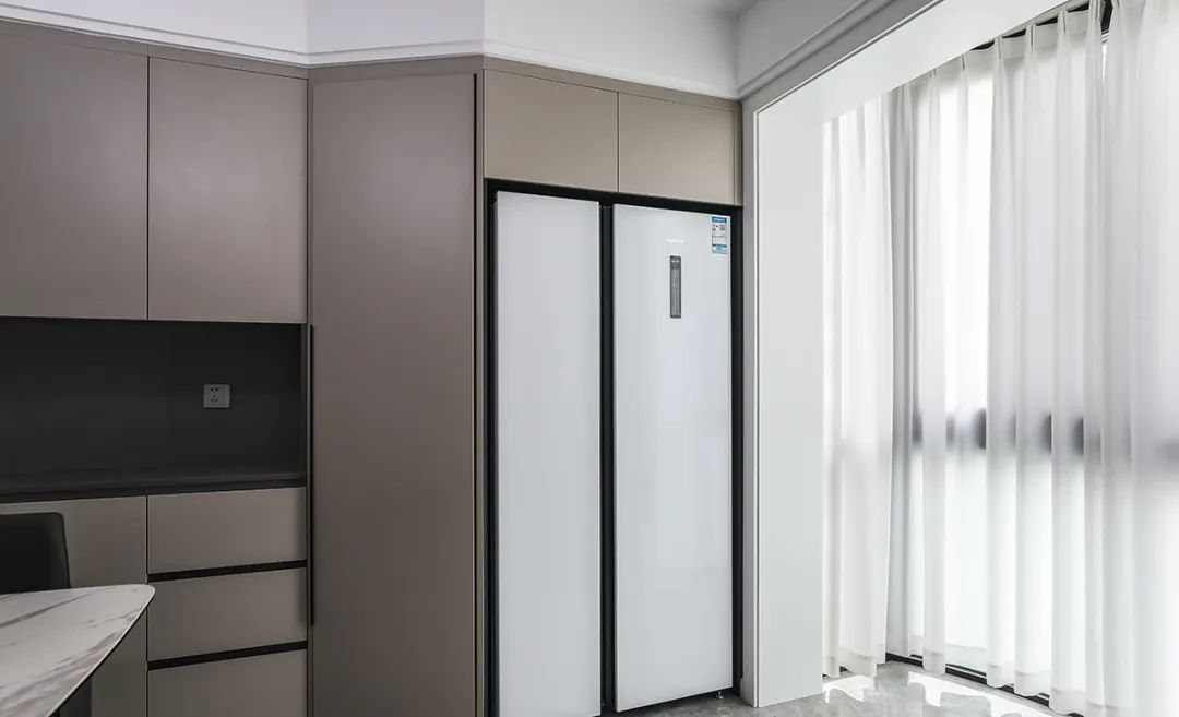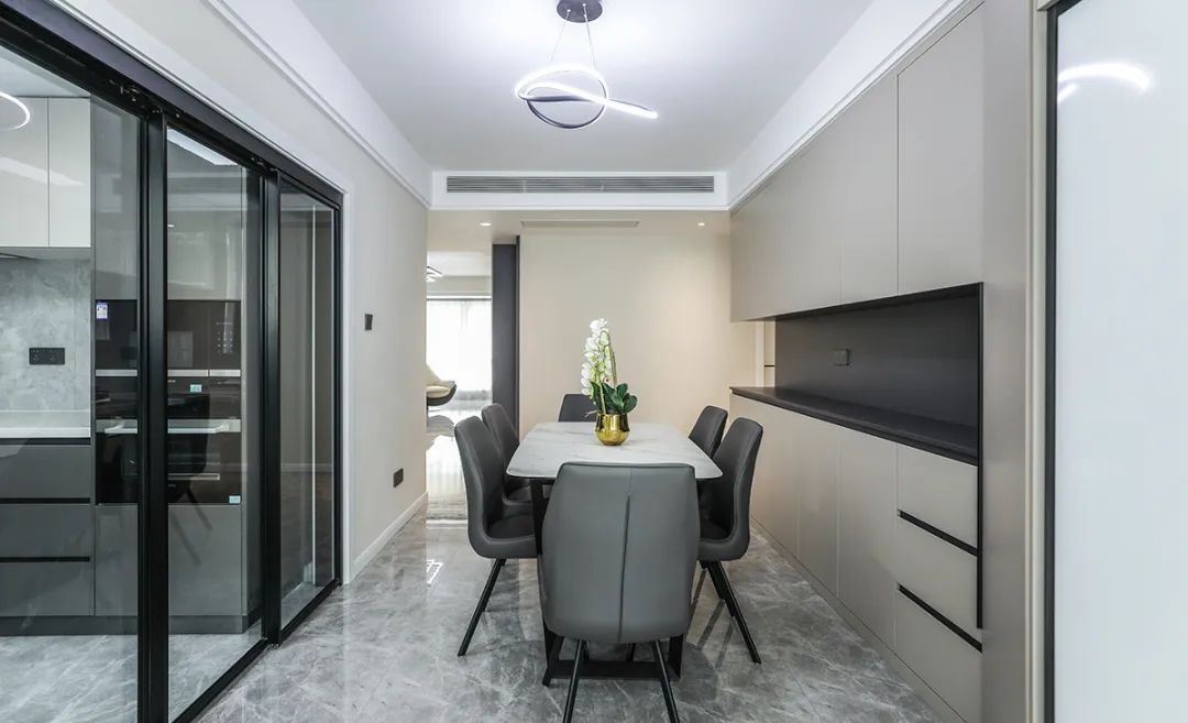 餐廳的餐邊柜加上雙門大冰箱一體合成,灰色柜體板和瓷磚呼應(yīng),奶咖色柜門板讓整個家庭溫馨起來,超薄巖板餐桌簡約大氣。