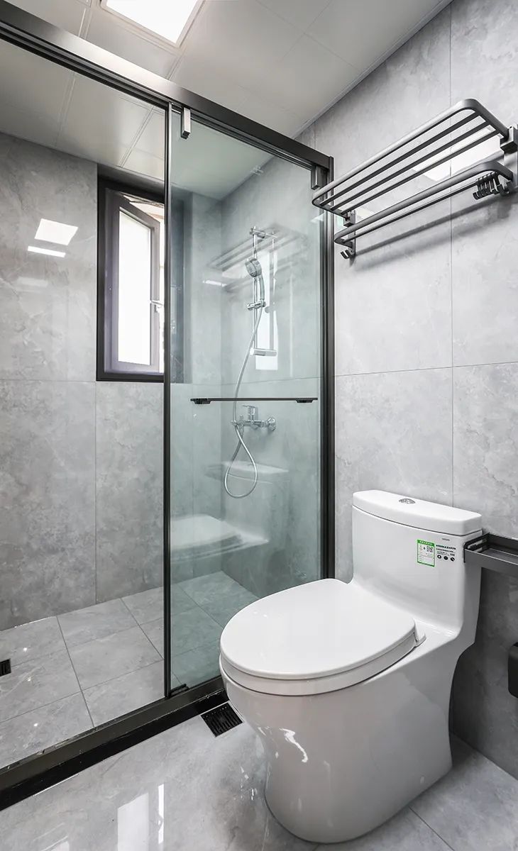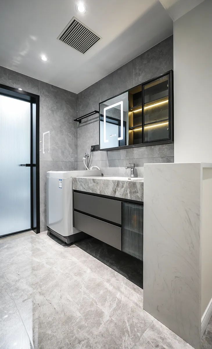 暖灰的色調(diào),干區(qū)1米的臺盆柜邊上還可以放一個備用洗衣機,衛(wèi)生間長虹超白窄邊開門,極簡的線條,600*1200的墻磚顯得衛(wèi)生間更加大氣。