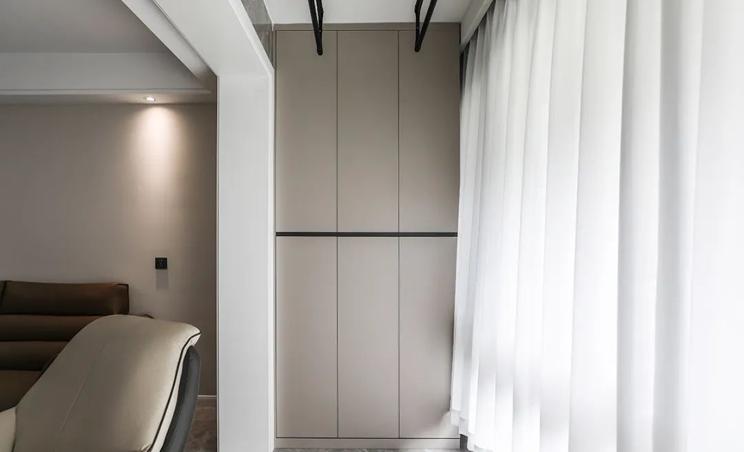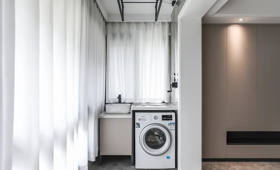 陽臺落地玻璃,洗衣柜的一面砌了矮墻,方便排水管,整體更美觀。陽臺的承重墻兩邊對應(yīng)著一面儲物柜,一面洗衣機臺盆組合柜,簡約大氣,功能合理分配。