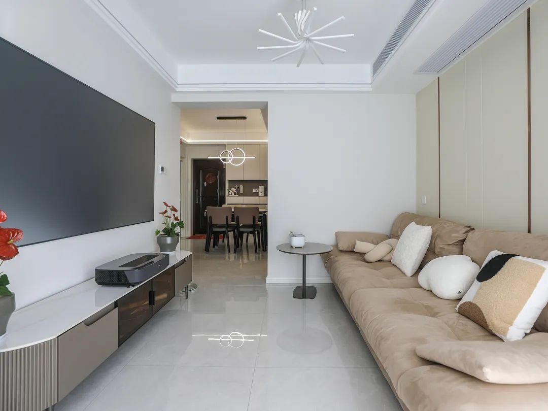 客廳空間并不大,電視墻也并不是很長,所以沒有做過多的裝飾,后期配上65寸的電視更顯簡約。暖色調一字型布藝沙發讓家的環境更添溫暖。吊頂造型上采用雙眼皮吊頂,下邊沿嵌入線條燈,增加房屋的層次以及氛圍感。地面采用淺灰色地磚,讓簡約風設計更顯白凈透亮。