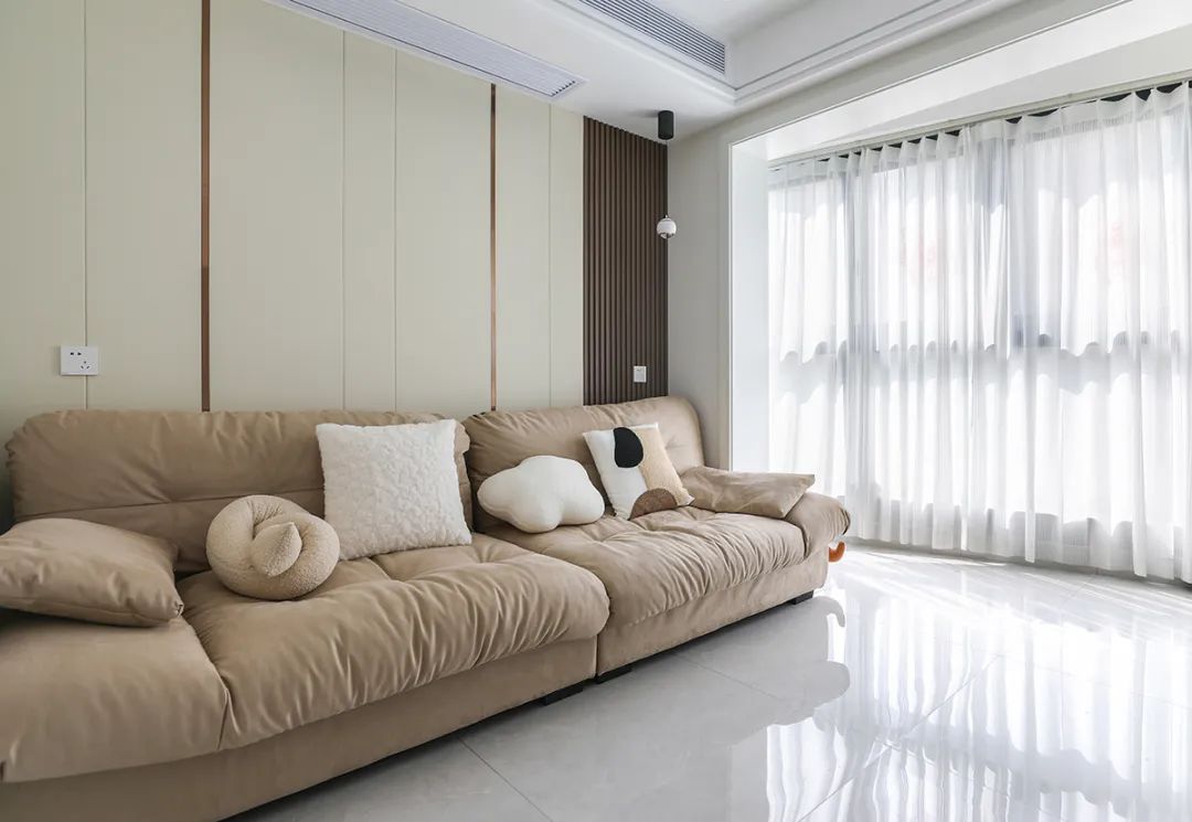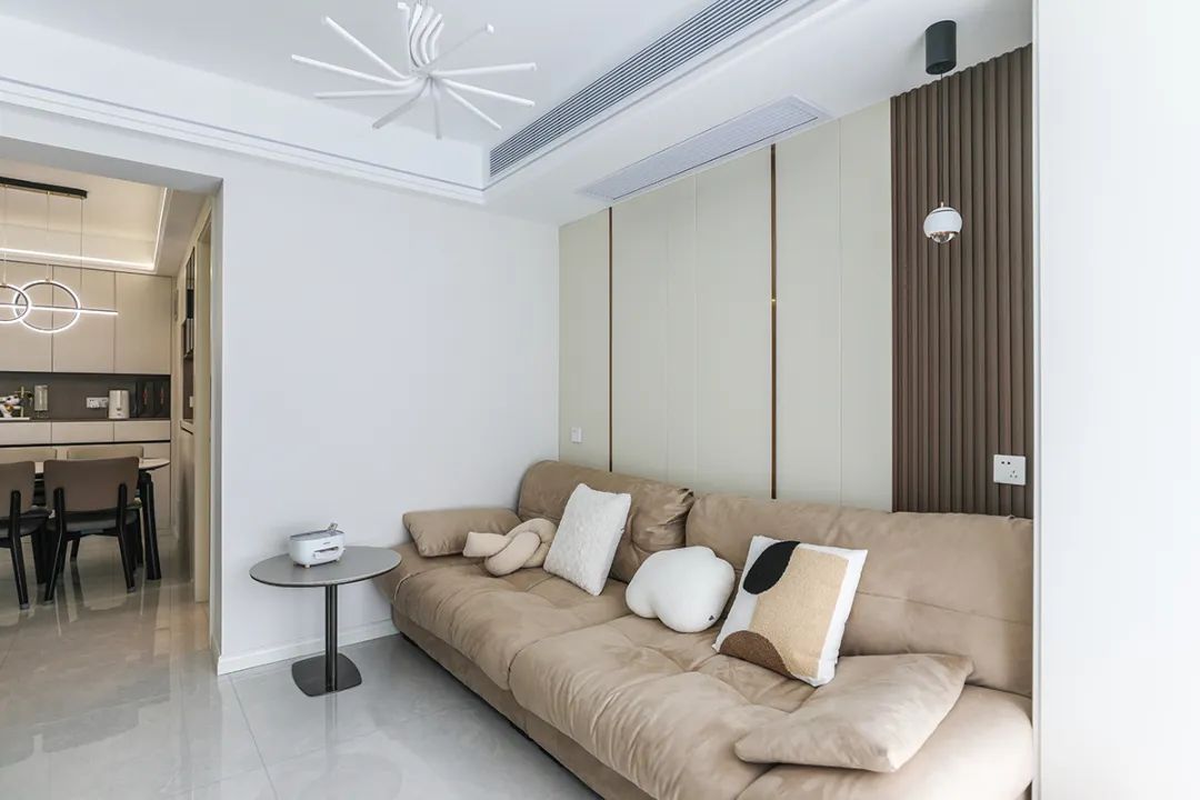 由于整體裝修風格顏色以白色為主,所以沙發背景墻采用了木格柵以及硬包搭配來裝飾。這樣做可以增添一些重色使整體空間更加穩重和協調。