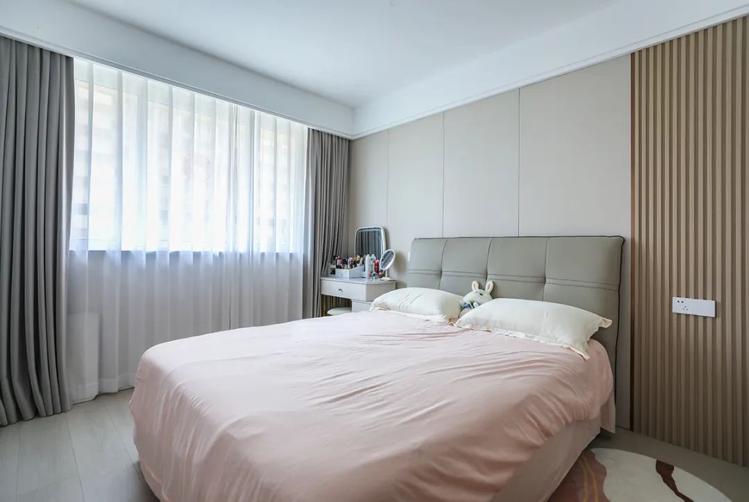 主臥床頭背景和客廳沙發背景采用了一樣的材質來裝飾,做到了統一風格以及色系。地板選用淺色系的灰木紋地板,再配上同色系的床來搭配,讓整個空間顯得干凈簡潔。