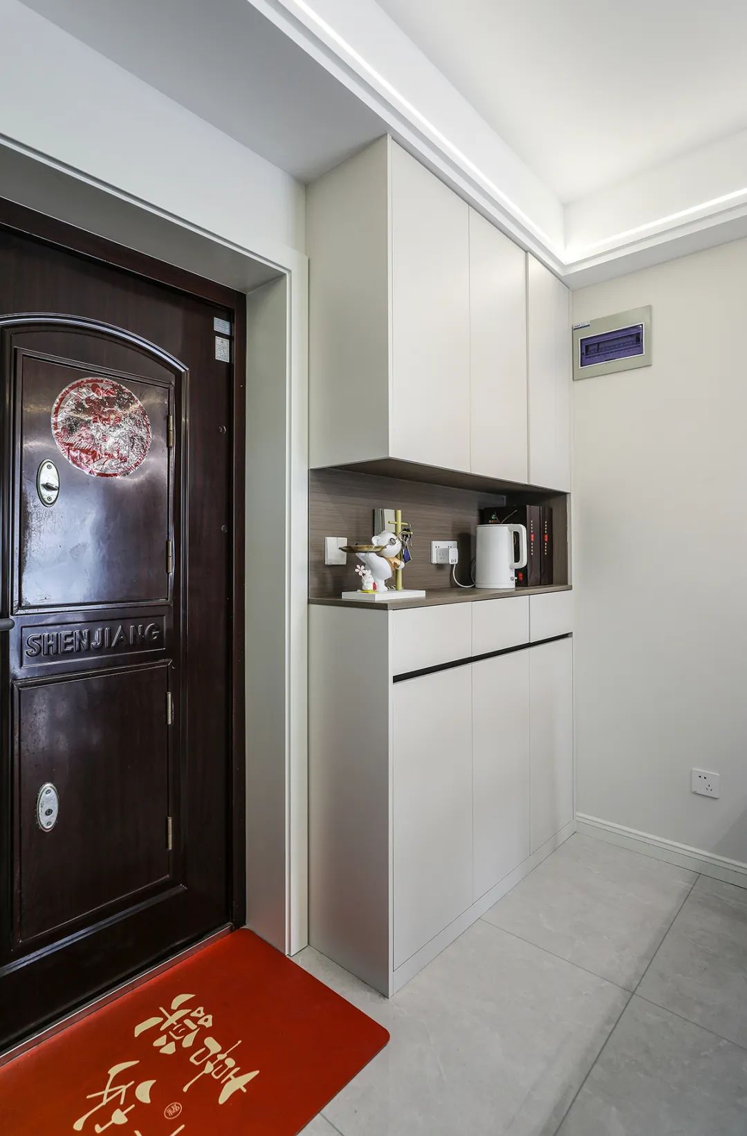 進門玄關柜設計采用上下完全分層設計,增加收納空間的同時讓這塊空間更具設計感。柜子采用免拉手設計,時尚的同時更易清潔,減少家務。