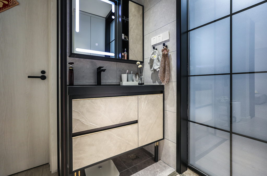 設(shè)計說明:這款設(shè)計采用了輕奢風(fēng)格的裝飾和材質(zhì),使用金色鑲邊鏡框和條紋大理石板材。黑色的收納柜和白色的潔具在顏色上形成了鮮明的對比。黑、白、灰元素,色調(diào)統(tǒng)一豐富。整體設(shè)計輕奢而豪氣。
