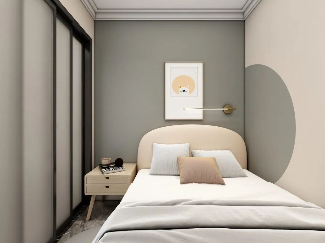 設計說明:使用幾乎圖形覆蓋整個墻面,將設計感與家居融為一體。選擇一些與個人審美和風格相符的畫作,能夠讓臥室充滿個性和生命力。同時,這種設計也能讓空間顯得更加寬敞和明亮。