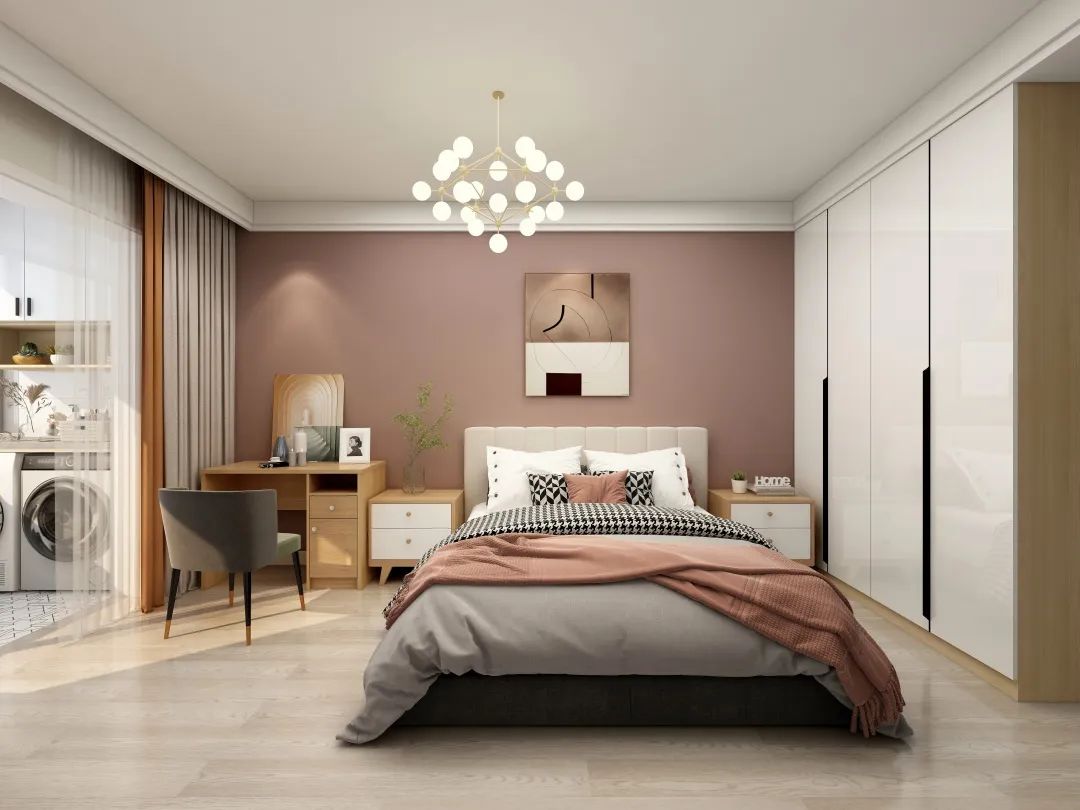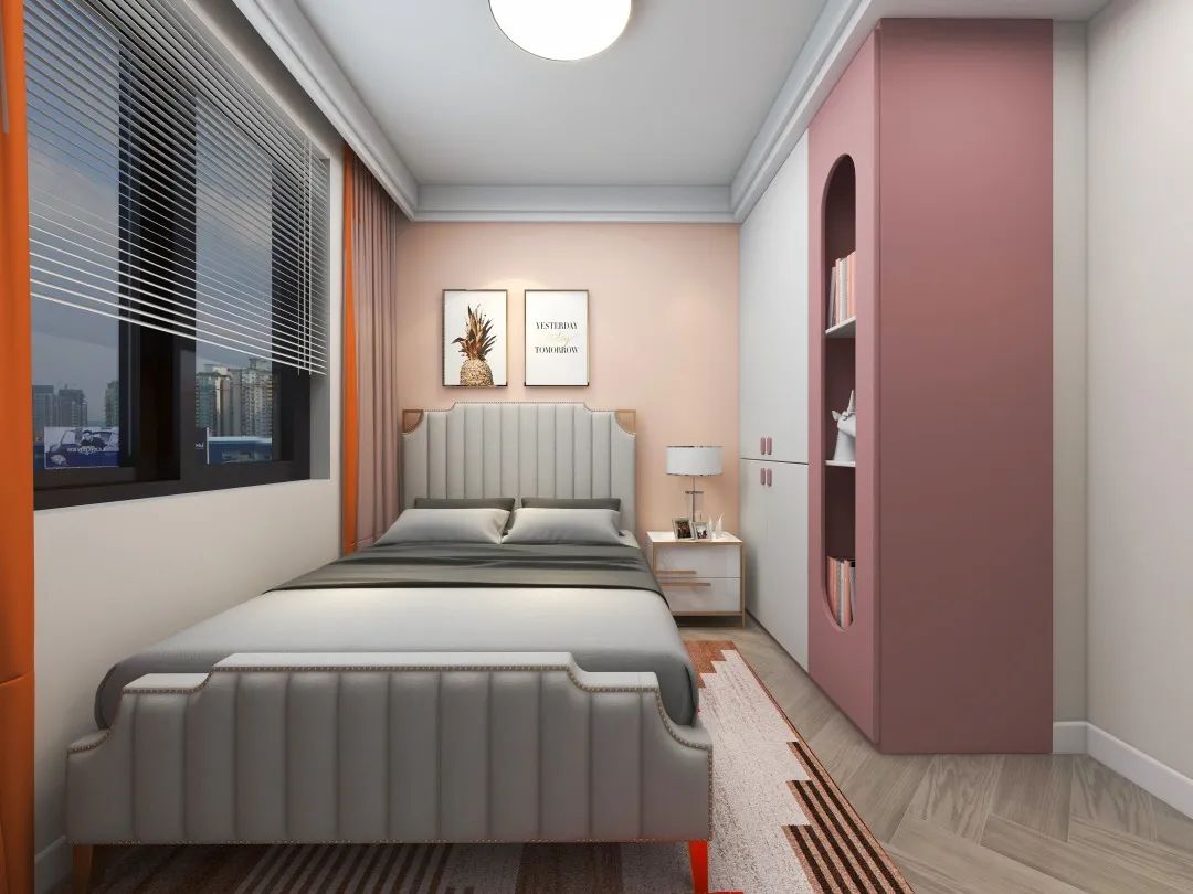 設計說明:這套案例色彩比較豐富,均采用暖色系色彩。搭配朱砂粉家具,營造出浪漫、清新的少女心臥室。墻面采用粉色和灰色乳膠漆,地面鋪設木色地板,搭配灰色的床品,增加空間舒適、爛漫感。