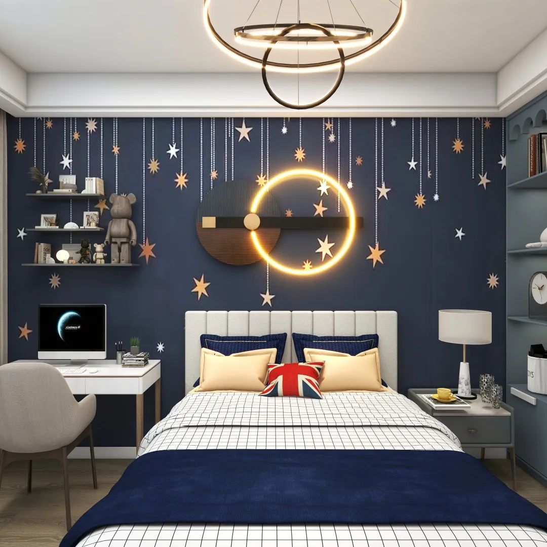 設計說明:這款背景墻以星空為主題,采用深藍色和白色為主要色調,讓人感到寧靜和神秘。背景墻上掛滿了星星裝飾,給人一種仿佛置身于宇宙之中的感覺。另外,背景墻還采用了燈光設計,通過設置燈光來模擬星空的效果,讓人感到更加浪漫和溫馨。
