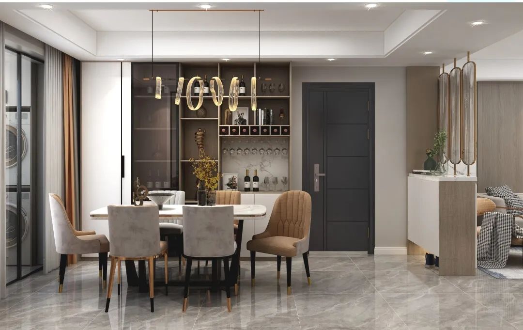 設計說明:設計師以現代簡約風格為主題,通過底柜加玻璃隔斷的形式將客廳和餐廳分開,使這兩個空間既獨立又聯系。三個金邊切圓的隔斷設計增加了空間的趣味性。簡約的設計風格讓這個餐廳更具有一種無拘無束的感覺。
