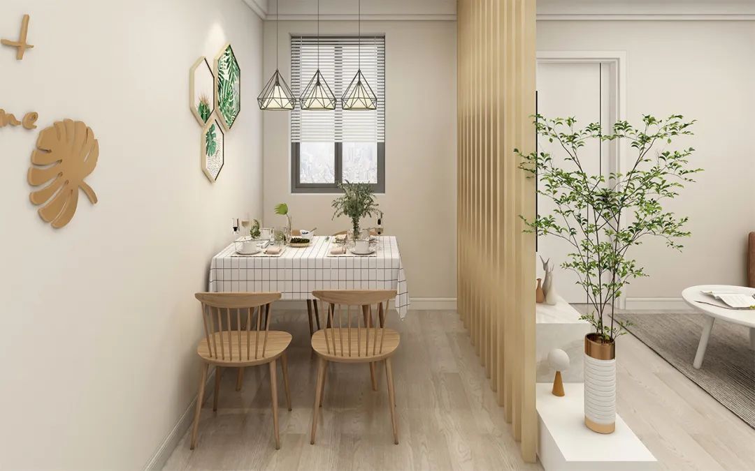 設計說明:這款案例柵格木質材質的隔斷作為餐廳與客廳之間的隔斷。設計不僅具有裝飾意味,同時還可以在餐敘時營造出舊時光的氛圍。此案例中的隔斷可移動,使客廳與餐廳的空間視覺上變化多樣,當親朋好友來家聚餐時不同的布置會是不一樣的歡樂氛圍。