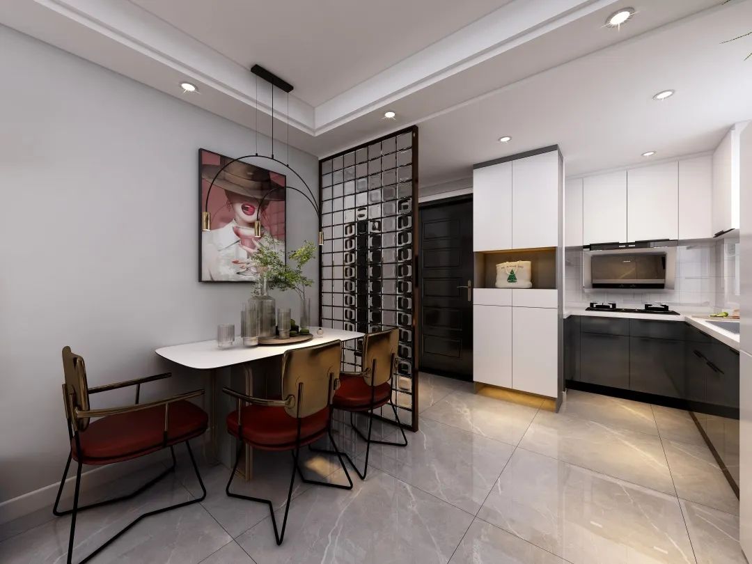 設計說明:本案例隔斷采用了黑白配色方案,黑色的底柜四邊和白色的柜門、屏面形成了強烈的對比。而且與廚房推拉門相呼應,使整個空間視覺更加統一。