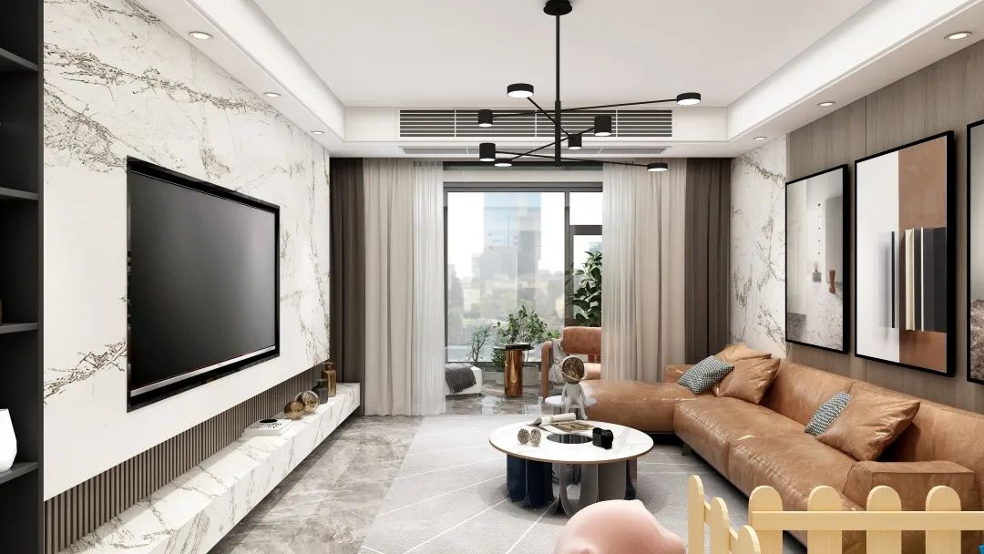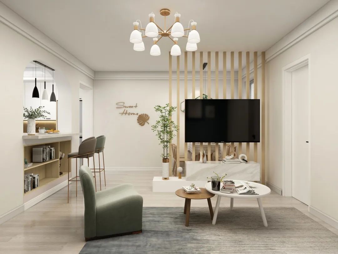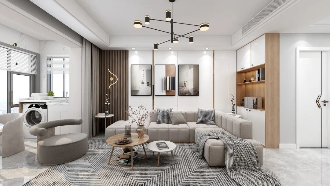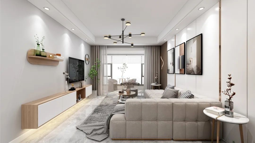 設計說明:這套設計采用了簡約的線條和流暢的造型,無扶手沙發簡潔舒適,搭配現代風格的茶幾和燈具,營造出一種時尚、簡約的家居氛圍。適合喜歡簡單生活的年輕家庭。
