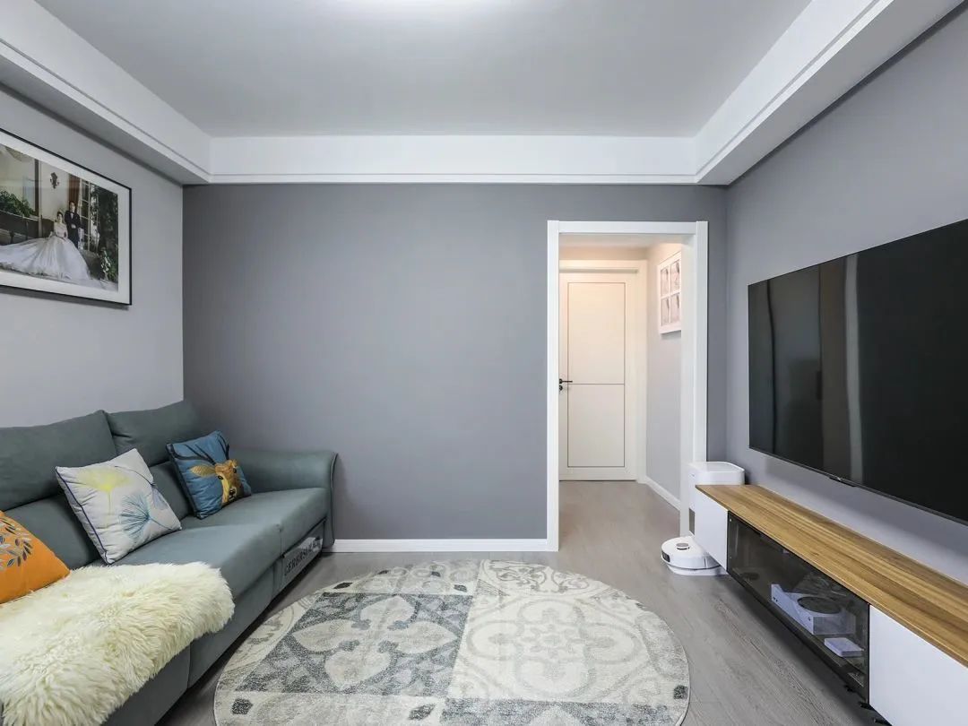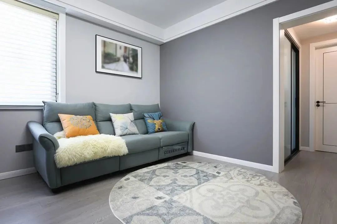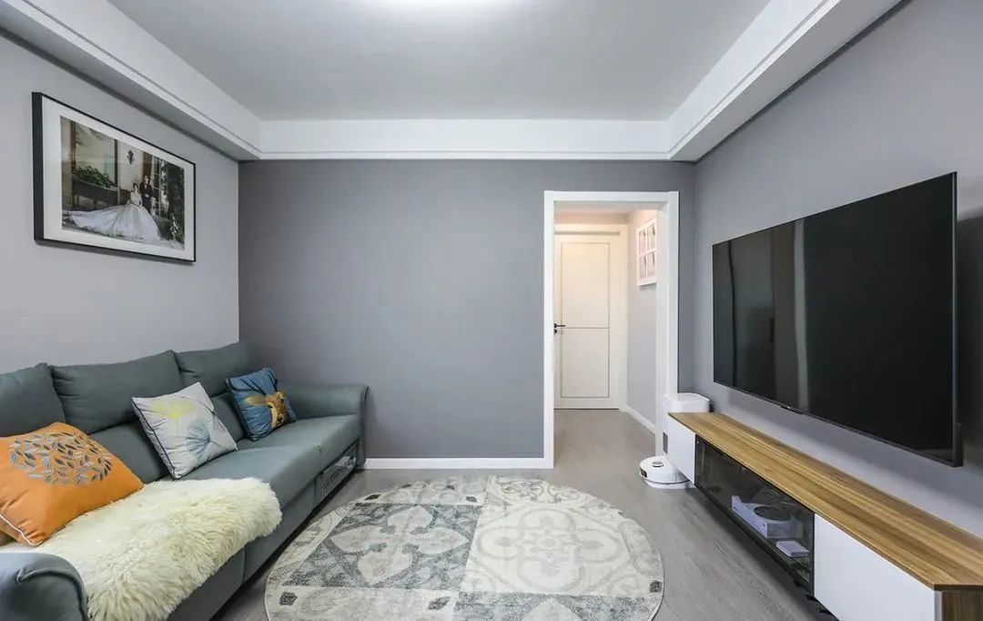 由于客廳空間面積并不富裕,于是借用視覺心理增加空間感,通過不同灰度拉開前中后層次,增加空間延伸感。并且在局部運(yùn)用了亮色作為點(diǎn)綴豐富場景,比如沙發(fā)上的抱枕,電視柜的木飾面,地板的圖騰色塊,增加空間的樂趣。