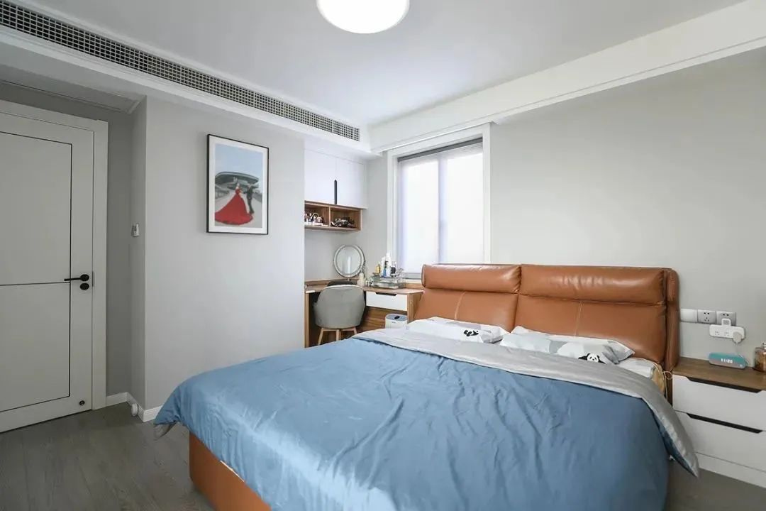 秉持“主臥居住”原則,在此空間內(nèi)我們并沒有過多贅述,而是合理地利用了空間、統(tǒng)一了整體風(fēng)格。考慮到色彩對睡眠的影響,墻面乳膠漆采用了顏色稍淺的暖灰,提升明亮、溫暖感。