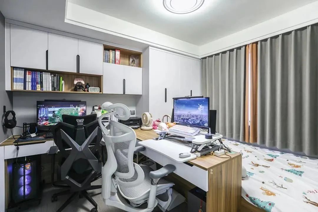 次臥是設(shè)計(jì)的一個(gè)亮點(diǎn),整體依然屬于原木色系列,最有趣的是把電腦區(qū)、學(xué)習(xí)區(qū)、睡眠區(qū)巧妙的結(jié)合在一起,做到空間的最大化利用。在保證有睡眠區(qū)域的同時(shí),用幾平米打造出夫妻二人的娛樂、游戲空間。