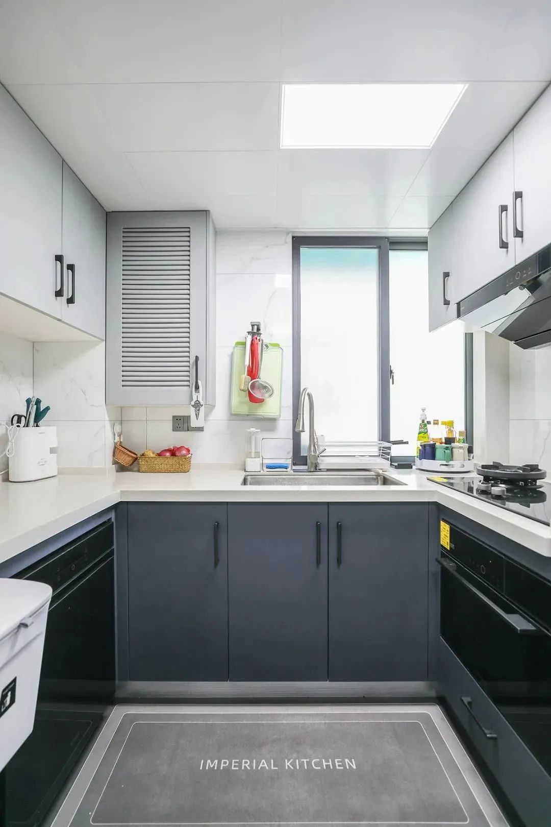 廚房設(shè)計(jì)采用了U型操作臺,使廚房操作擁有最佳動線。顏色搭配上白下灰,石英石臺面與上柜顏色遙相呼應(yīng),上端的淺色系與下柜的灰色系又形成碰撞,讓整個(gè)空間輕快許多。