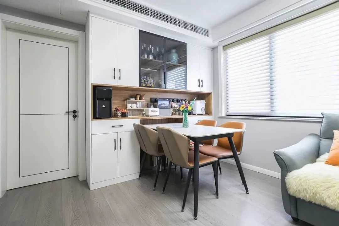 餐邊柜整體采用原木色內(nèi)里、奶白色門板,搭配巖板的餐桌,皮質(zhì)的座椅,簡約大氣又不失清新明朗,既能保證用餐時(shí)的清新雅致,又能與客廳灰度空間形成視覺延伸感。