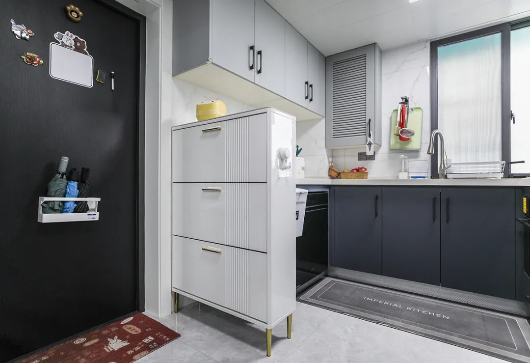 由于空間有限,進(jìn)門玄關(guān)僅做了半高收納柜。收納柜的底部是鏤空設(shè)計(jì),鏤空高度大約15厘米,是一雙高幫鞋的高度,可以很方便的進(jìn)出換鞋。柜子臺面也可以放置包包、進(jìn)門鑰匙等,也可以放置一些裝飾擺件美化空間。