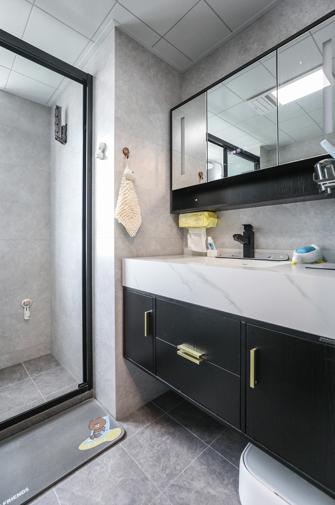 時(shí)尚的現(xiàn)代簡約衛(wèi)生間,強(qiáng)調(diào)的是去繁留簡,常見的線條和幾何圖形的交織便能將衛(wèi)生間個(gè)性展現(xiàn)出來。衛(wèi)生間整體仍以黑白灰三色為主,鈦合金移門、臺盆鏡柜等基本如此,可見主人對這個(gè)色調(diào)的鐘愛,整體表現(xiàn)簡約優(yōu)雅,寧靜致遠(yuǎn)。