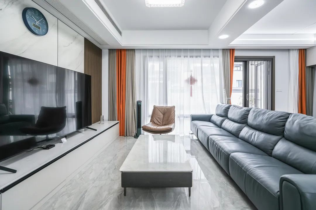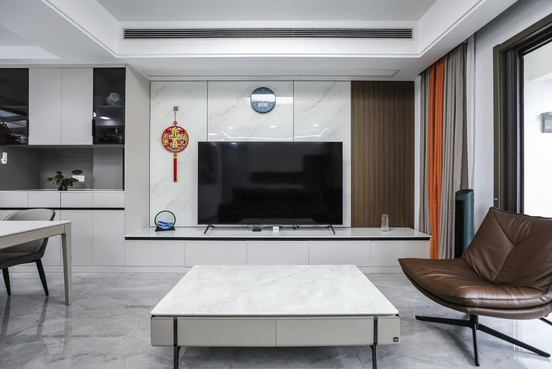 電視背景與餐邊柜融為一體,縱向的延伸增大客廳的比例感。巖板電視背景也很大氣,讓空間不但時尚而且清爽。