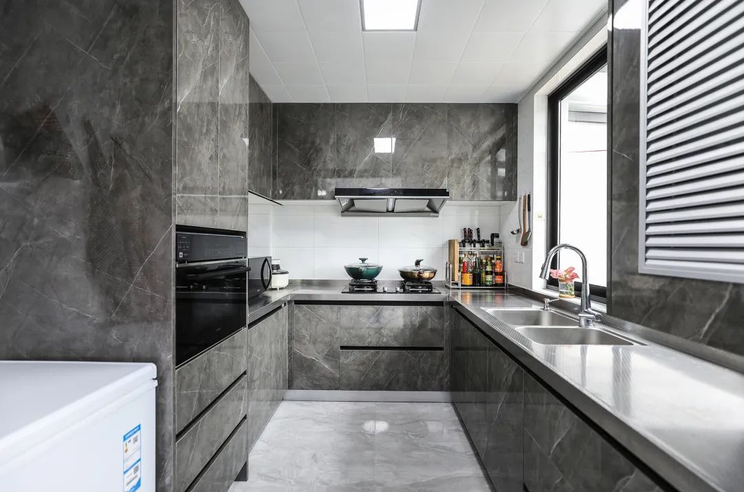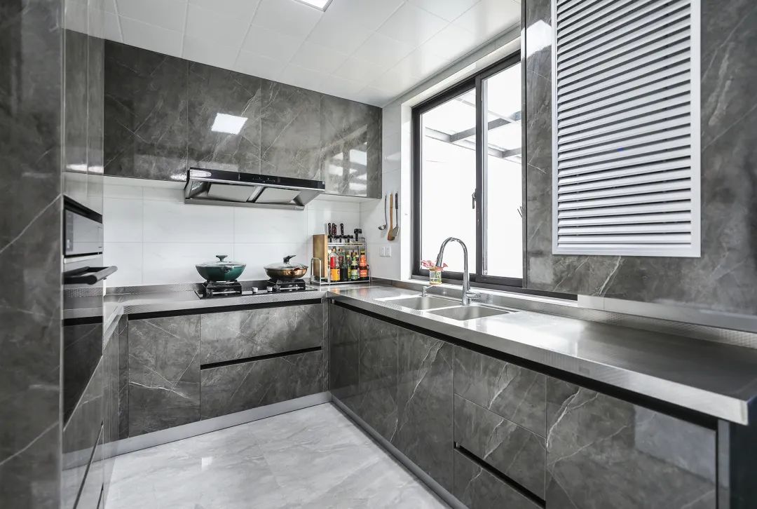 廚房以精致、豪華、高雅,注重品質和個性化。采用黑色和淺色調,營造出高貴、典雅的氛圍。櫥柜、臺面和餐具等主要元素均采用精致的線條和材質,突顯高雅氣息。