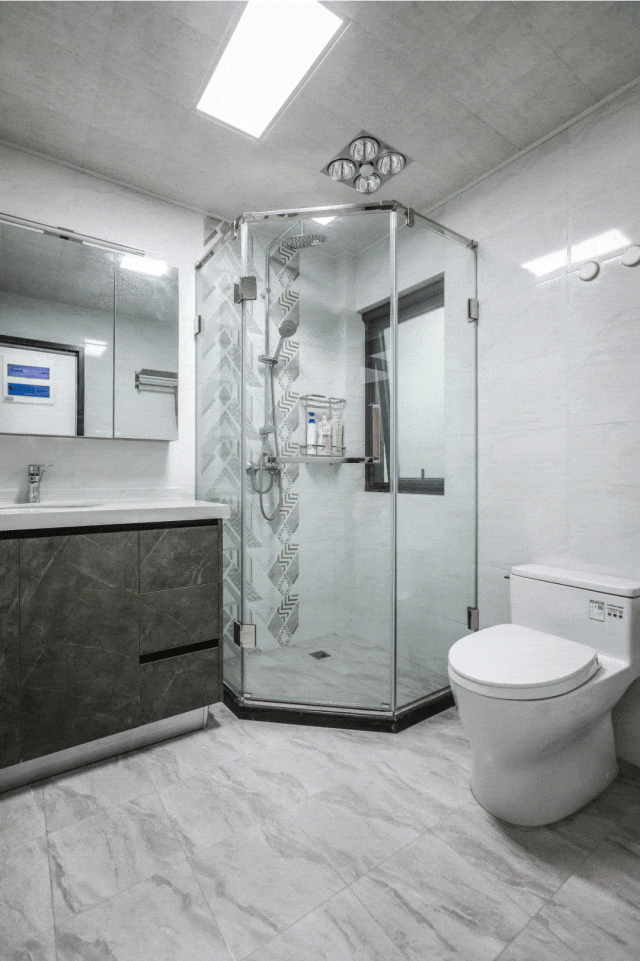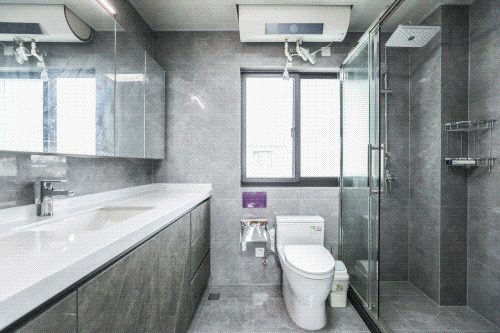 主衛空間也很大,只放一個馬桶,一個洗手臺,做一排儲物柜,增加主人的收納空間,黑色邊框長虹玻璃門,讓整個空間協調統一,大氣時尚,主人很滿意,不斷地夸贊對色彩的精準把握。