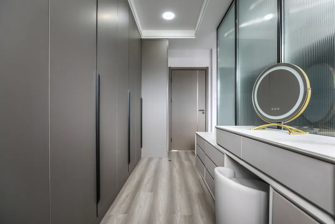 現代簡約風格的衣帽間以簡潔、流暢的線條和寬敞的空間感為主,營造出時尚、實用的氛圍。采用灰色通頂衣柜,與整個空間的色調相協調,同時增加了儲物空間和視覺的統一感。多面玻璃設計在滿足臥室空間隱私性的同時,也增加了空間感,使衣帽間看起來更加寬敞。