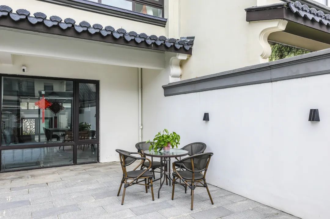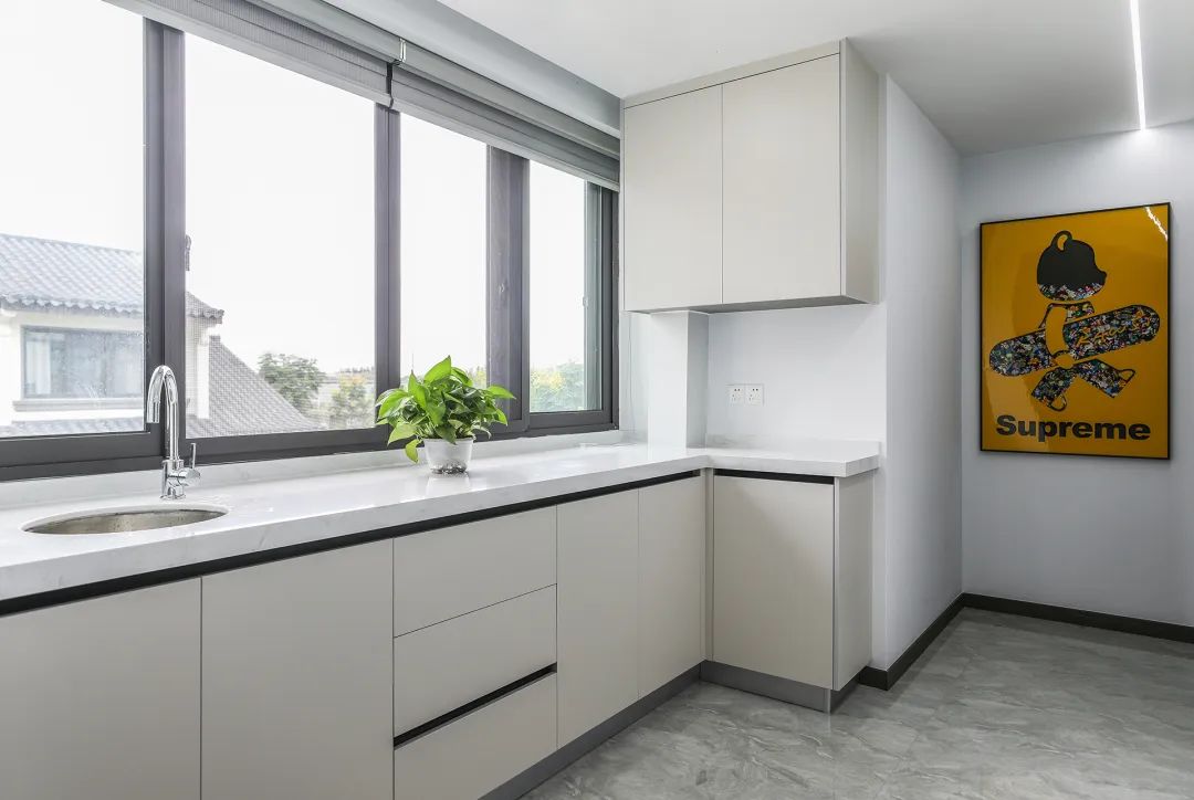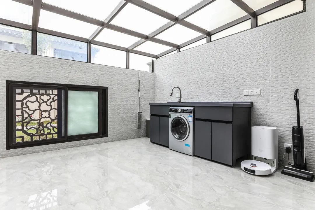 北露臺是晾曬衣物的場所,一側洗衣機和水池,一側為儲物柜,超大玻璃天窗讓陽光柔和的照進來,很舒適、很愜意。極具“白墻黛瓦馬頭墻,回廊掛落花隔窗。”的徽派建筑甄格。
